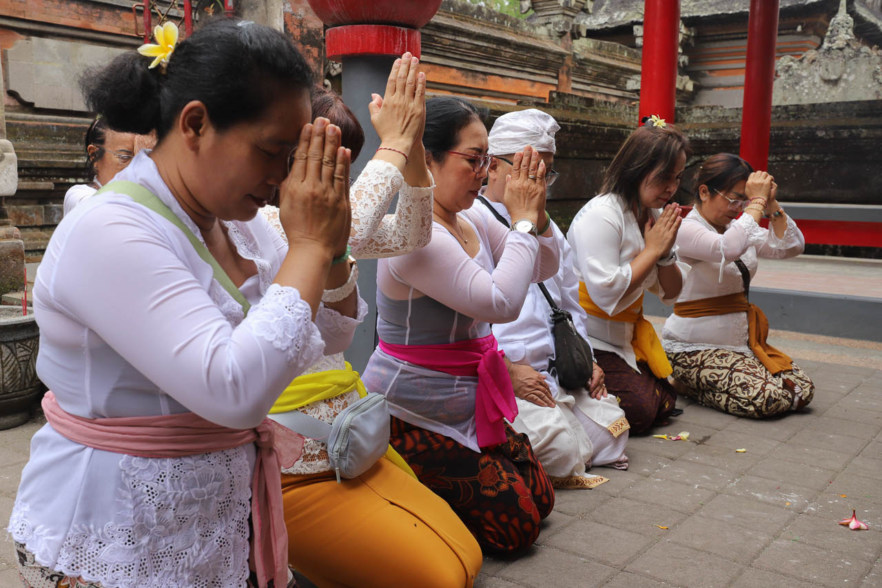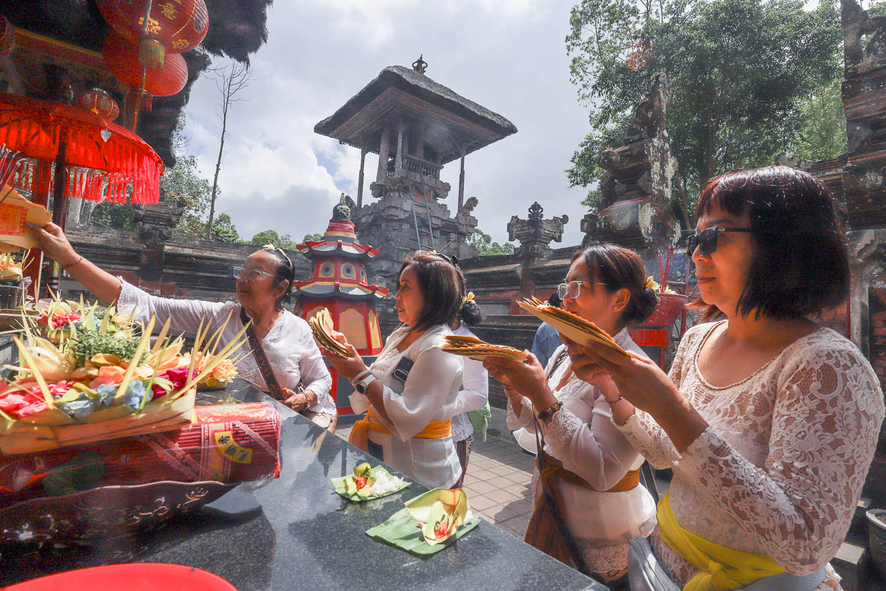 A side sanctuary at the northeast corner of the first courtyard honors Kang Cing Wie, known locally as Putri Ayu Subandar, today still honored as the goddess of prosperity. The Gedong Linggih Ratu Ayu Mas Subandar shrine, adorned with red and yellow colors like Buddhist temples, features a prominent giant kepeng coin as a symbol of prosperity. Rituals here blend Hindu and Buddhist-Chinese elements, with offerings sometimes performed standing (“Chinese” style) and sometimes kneeling (Balinese Hindu style), reflecting active syncretism.
