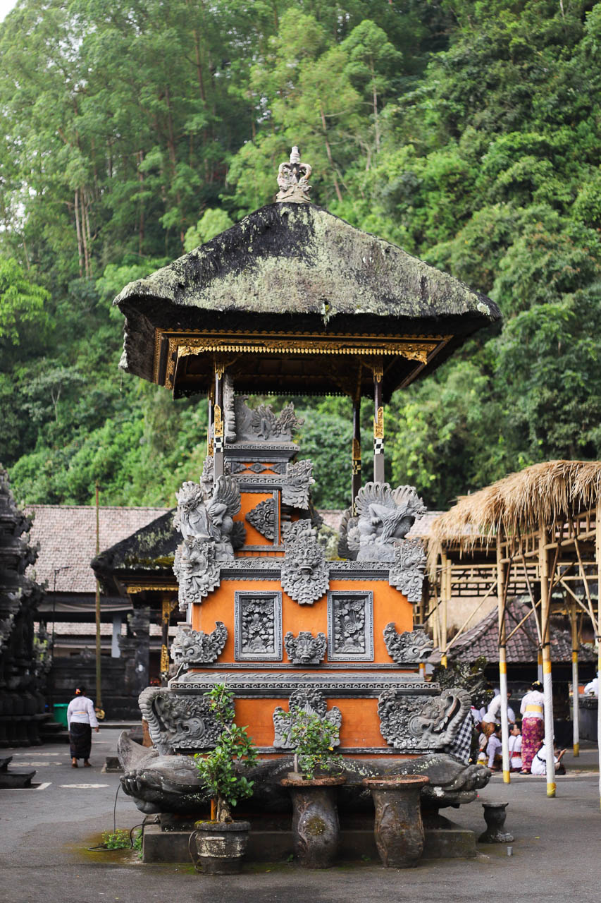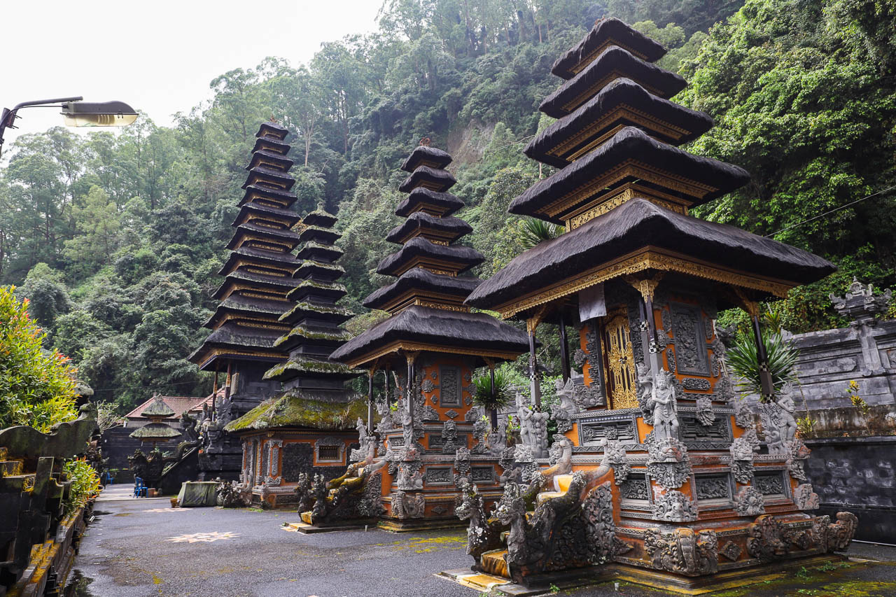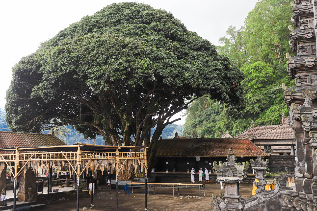 Following typical Balinese design, the temple complex features three courtyards: outer, middle, and inner, in this temple arranged left to right. The narrow inner sanctuary, set against an overgrown cliff, contains seven meru shrines that increase in height from south to north, with an eleven-tiered shrine dedicated to Dewi Danu at the northern end. The middle court hosts ritual pavilions such as Padmasana, Paruman Alit, Bale Peselang, and Gedong Dalem. The spacious outer courtyard is designed for gatherings and incorporates a drum tower (bale kulkul) at the southwest and two large shade trees at the northwest corner.