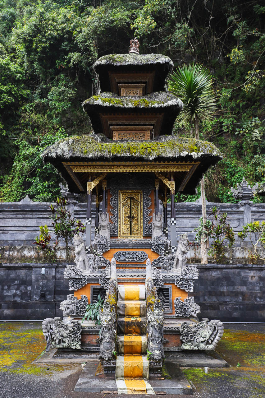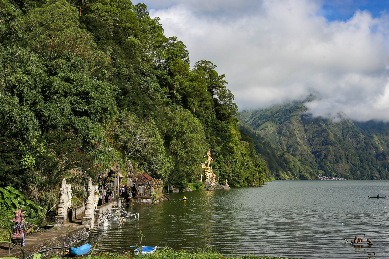 The road from Pura Jati along the lakeshore passes Toyabungkah, known for its volcanic hot springs, and ends at the northern tip of the lake where the waters meet the crater rim. Here, a temple stands built into the green caldera wall, distinct from the larger Pura Ulun Danu Batur, which was relocated to the southern crater rim a century ago.