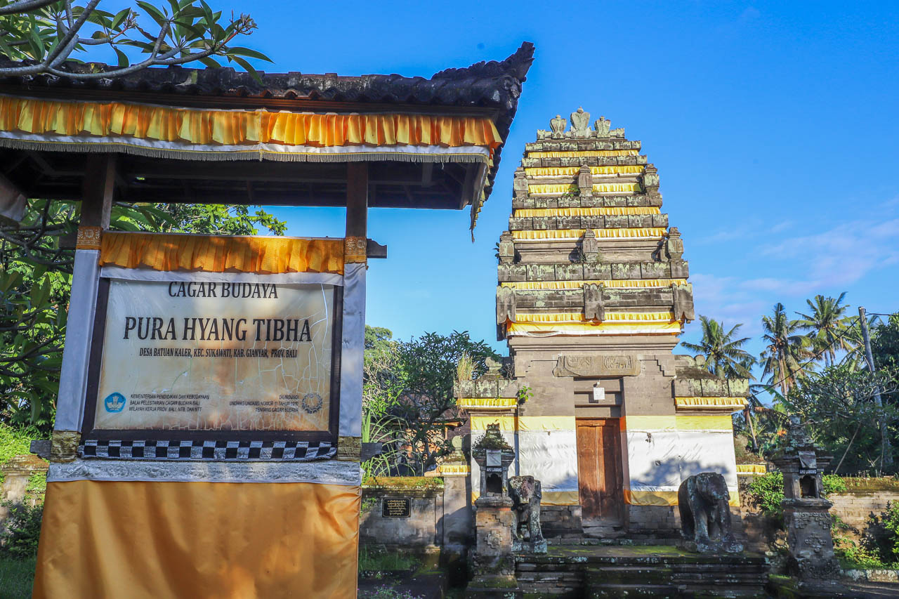 Local tradition and historical sources position Pura Hyang Tiba in a triadic relationship with the nearby Pura Puseh Canggi and Pura Puseh Batuan, forming part of a corridor of early sacred sites whose oldest inscriptions date to the 10 century. The area is frequently understood as an early centre of Balinese Hindu development, visible in the rich concentration of early stone carvings, gateway forms, and shrine types that precede or differ from later classical temple designs.