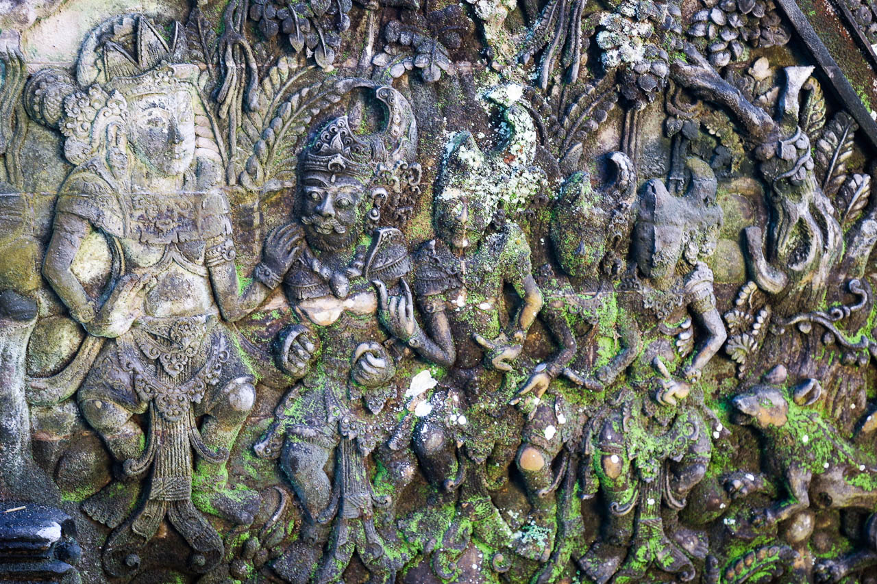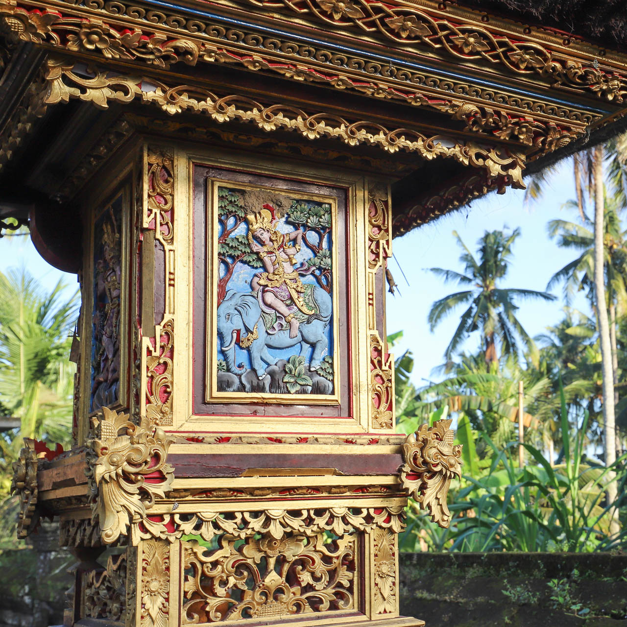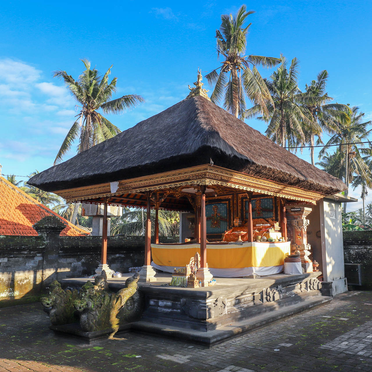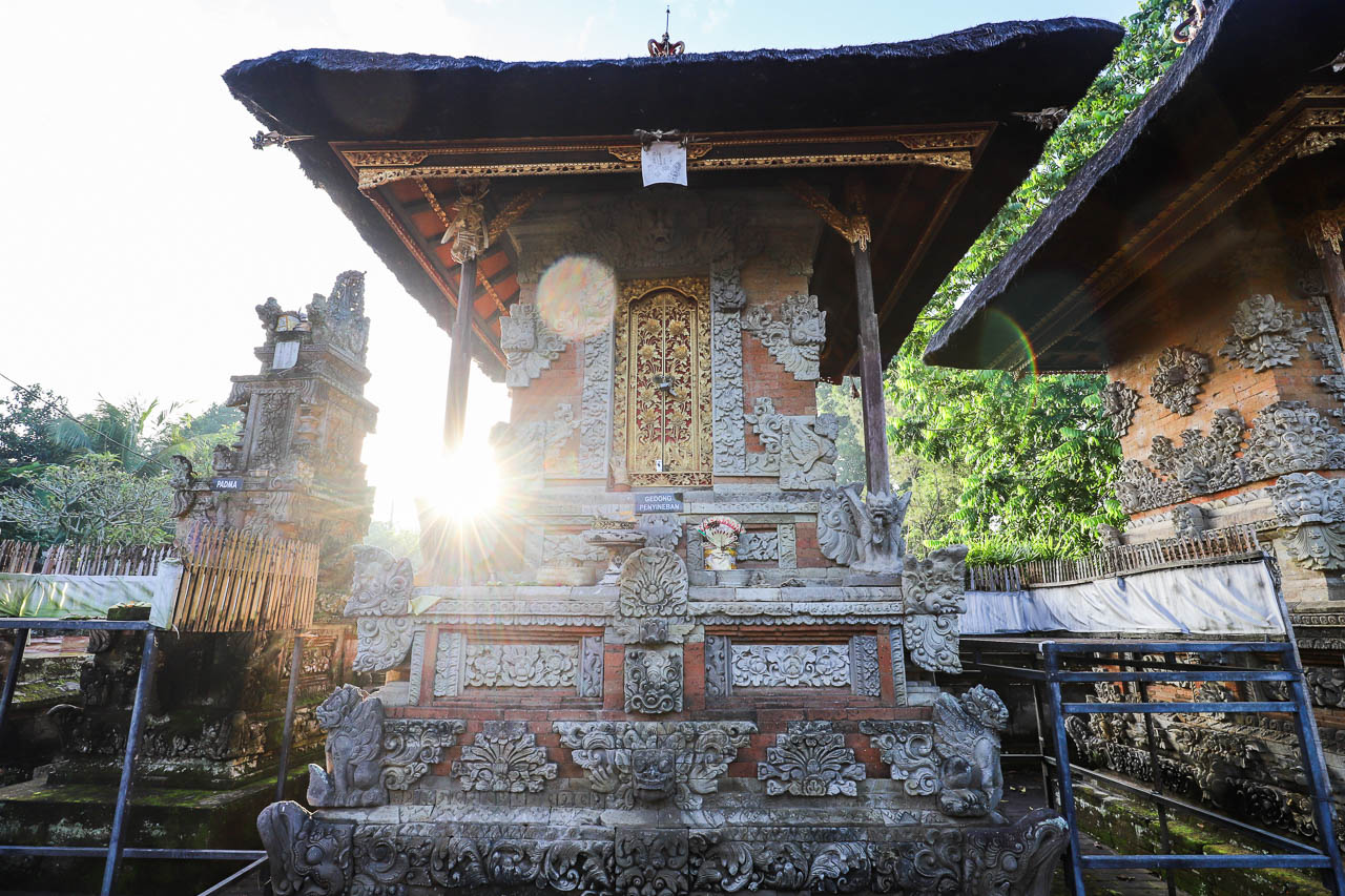 From the south of the central courtyard, a small path leads downslope west through rice terraces to the beji (spring) behind the main temple. The spring features two principal spouts feeding into a small river that flows toward the estuary, extending the temple’s sacred influence along the watershed. The beji is a site for melukat, where worshippers bathe under the spouts for spiritual purification.