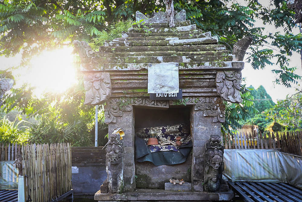 Together, the upper shrines and lower water source create a fire–water polarity (Ratu Hyang Api above, the beji below) within one integrated ritual unit.