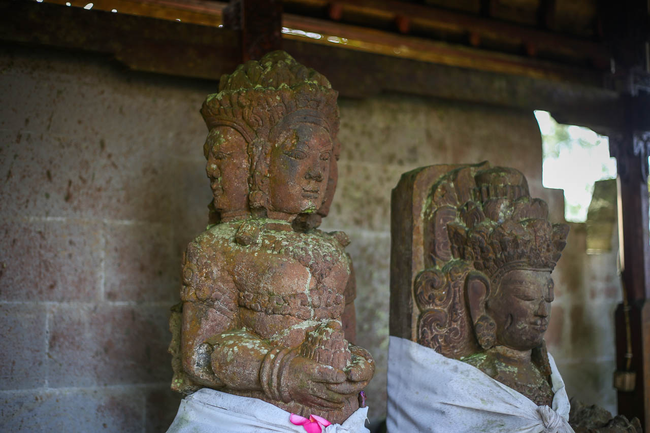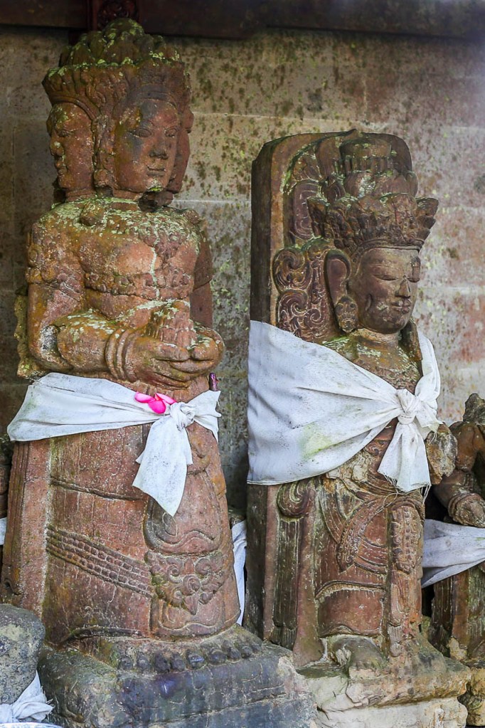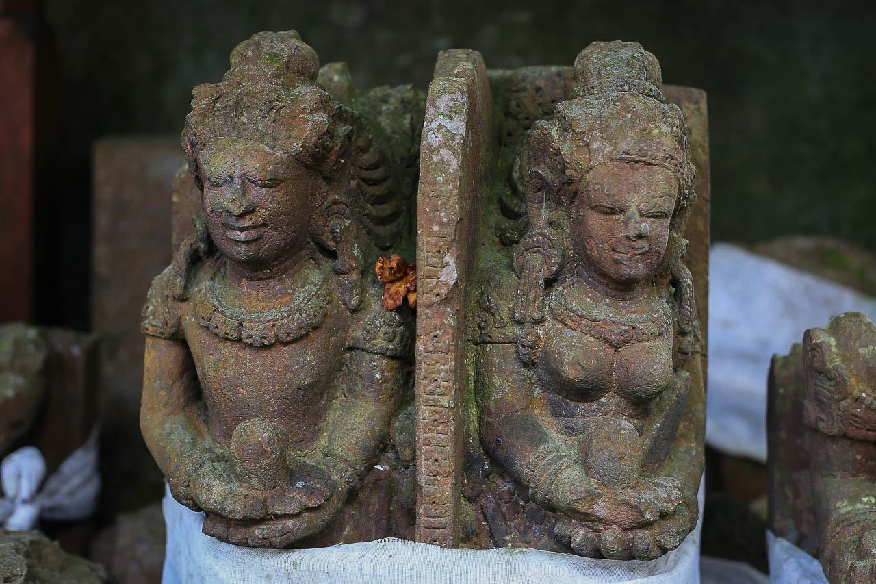 Some of the many ancient statues are of royal lineage and bear inscriptions indicating their consecration dates. The figure of Queen Bhatari Mandul, the consort of King Anak Wungsu, is dated to 1077 CE. Its inscription in the Kadiri Quadrate script closely resembles those found at Pura Gunung Kawi, which helped to date that site to the same period, the 11ᵗʰ century.