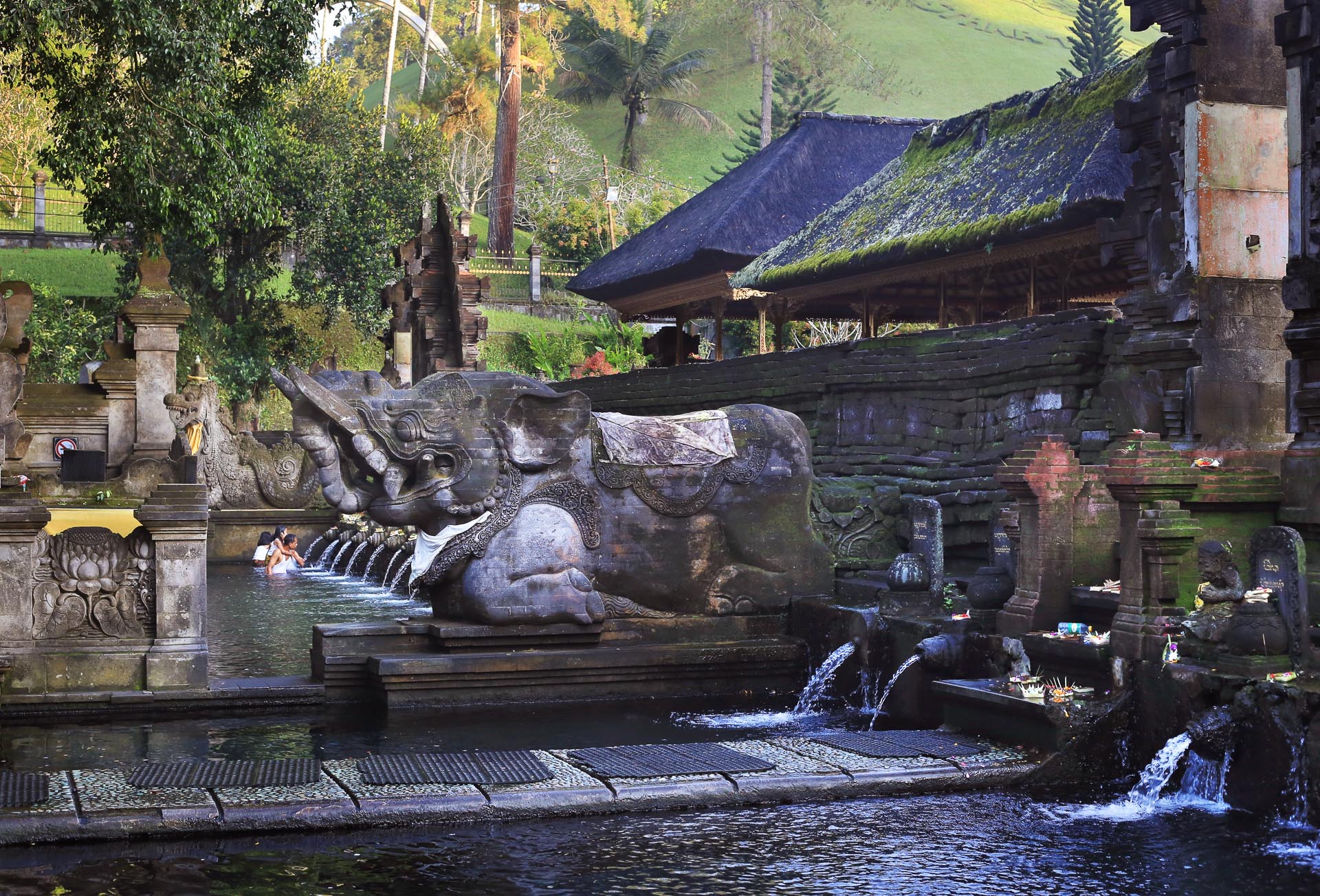 The temple’s central feature is a sacred spring. Its water is collected in a sacred pool and flows through a series of waterspouts into the bathing pools. The water, constantly fed by underground volcanic sources, is rich in minerals and maintains a stable temperature, contributing to its clarity and purity.