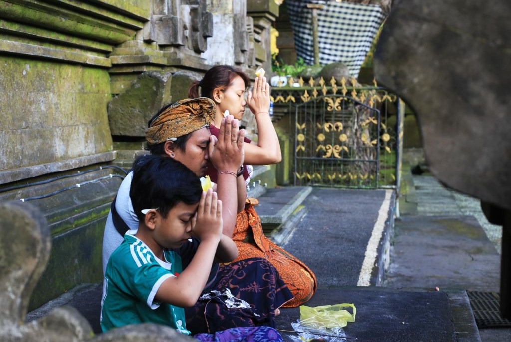 A Hindu family offers prayers before cleansing in the sacred waters of Tirta Empul.
