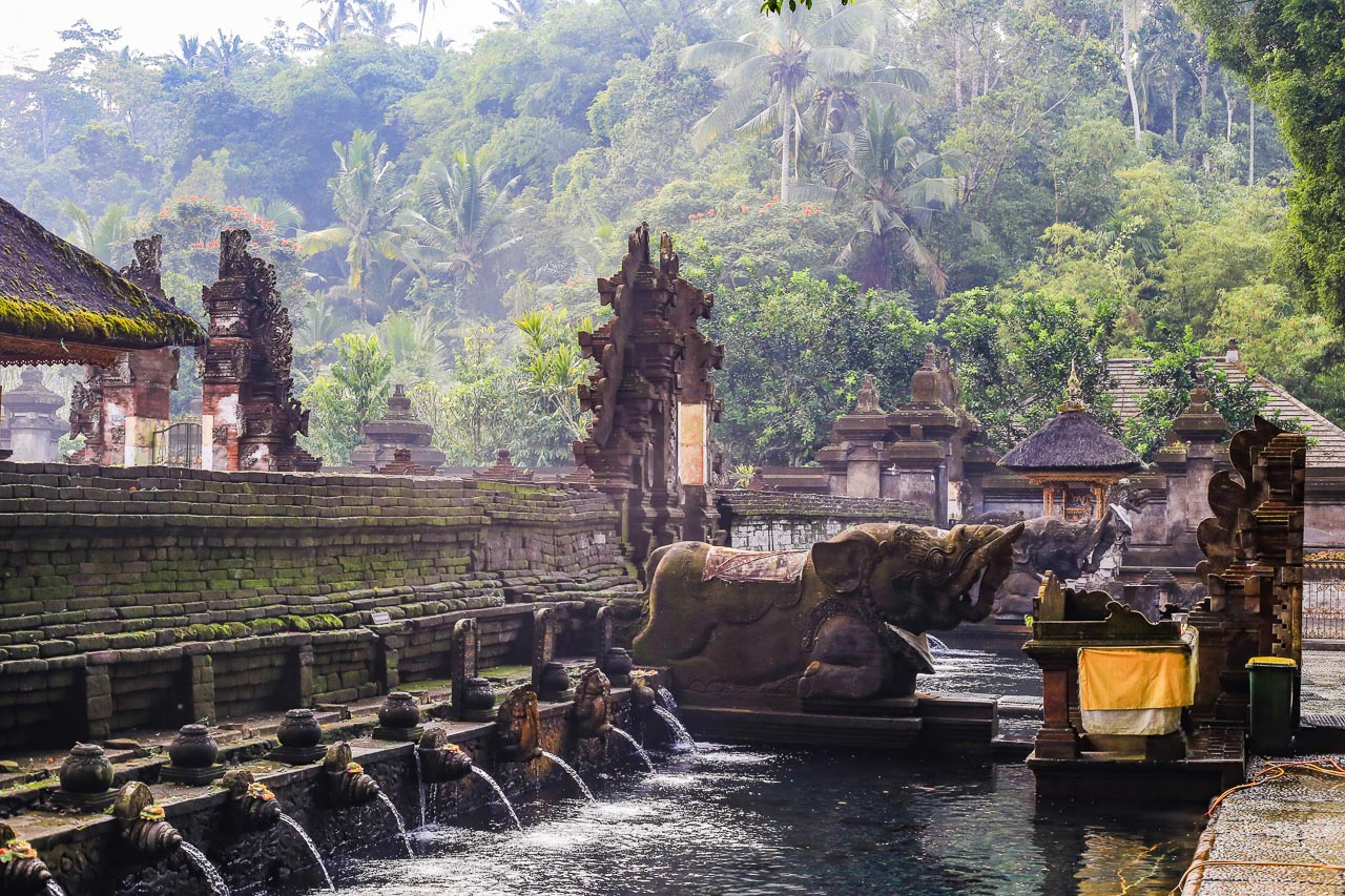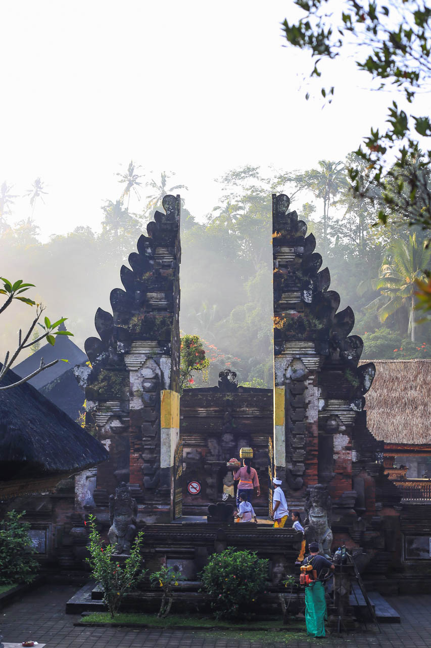Consider arriving early (before 8 a.m.) for a peaceful experience, and you can watch local families arriving for their ceremonial baths, cleaners of the compound and . eventually the soft morning fog lingering in the valley. The free sarong rentals at the ticket booth open only at 9am, so if you plan to visit early, bring your own sarong for temple entry.